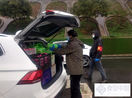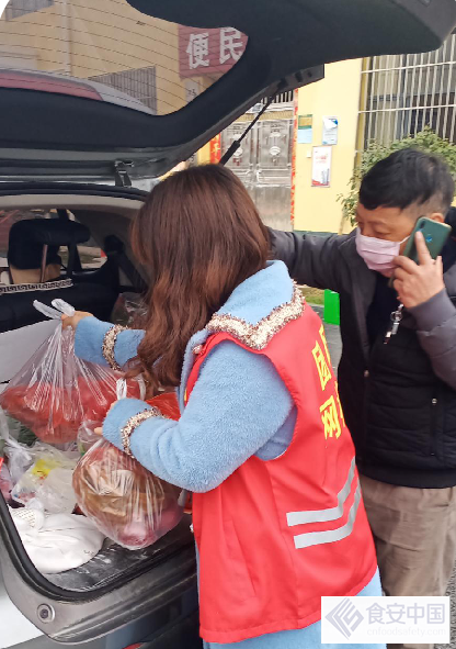 图二:党员和志愿者组织分发蔬菜粮油等物资。
