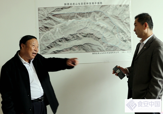 田总在大门口等着我们到来后,进入办公室,参观完后,对着陕西虎龙山生态农林发展平面图对我们说:“仲山距淳化县城西南4公里,为淳化、泾阳两县天然分界,此山峰恋叠翠,幽林穿谷,杂果丰盛,中草药繁多,野生动物可观,怪石嶙峋,异态秀出,原始山林氛围浓郁,为渭北寻幽探奇的天然生态家苑。我们的园地占地100多亩,经济林占地1000亩。基本占据仲山一条山脉。虎龙山频临泾河北岸,仲山山麓,气候宜人,风景优美,山林俊秀,空气清新,是居家,旅游的最佳选地。”