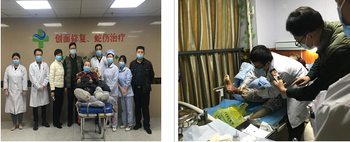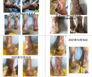 福州海福手外科医院创面修复科第一时间组织专家为赵君路进行会诊检查,发现赵君路双下肢已经坏死,感染严重,其双足跟部红肿、破溃加剧,已蔓延至双小腿后下段,且伴有跟腱外露及脓性分泌物流出,如果伤口创面感染不能够及时得到控制,将危及生命而必须进行截肢手术处理。福建医科大学第一附属医院血管科主任、畲药研发实验室首席专家张金池教授,海福手外科医院创面修复科主任、畲药研发实验室专家谢文洪主任医师,畲医药研发实验室雷言钦主任、雷荣起副主任等共同为赵君路制定了综合治疗方案,采用畲族特色创面疗法进行施治。据谢文洪主任医师介绍,该疗法源于千年畲医传统独特疗法,其特点是:“去腐生肌,清创保湿,护温生发,点状种皮”,直接在伤口创面用药,促进药物充分吸收,达到明显疗效。福建畲药具有千年的发展历史,民间草药疗效可靠。采用福建畲方生物科技有限公司和宁化县汇圆生物科技有限公司研发的一款皮肤溃烂畲药,古法研制,冻干鲜储,凝练炼成膏,可帮助患者迅速修复伤口,从而实现自然生长愈合。该药已列入省级畲族非物质遗产保护,并申请了发明专利认证。