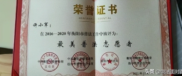 近日,衡阳市委宣传部、市委全面依法治市办、市司法局、市精神文明办组织开展了2016-2020年衡阳市普法工作“最美普法志愿者”推选工作,湖南君杰律师事务所许小军律师被评为“最美普法志愿者”荣誉称号。