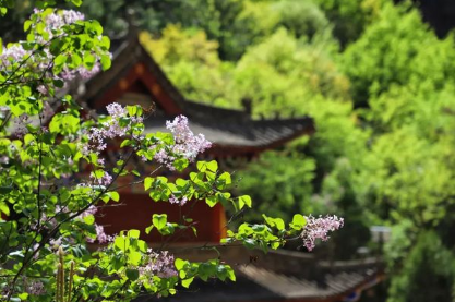 而六角亭就像是几座山峰的灯塔一样,不管你在步道上停留在哪个位置,都可以给你指引方向,让你不再迷茫和彷徨。回头,那些白色的丁香模糊着你的视线,更加含蓄地开放着。是啊!这里应该是白丁香,那是洗礼后的纯净,就如同我们走过这里,让心底再也没有一丝的忧愁,只醉在山水间,只醉在花深处。白丁香更适合在这里,彰显古寺的沧桑,更显万物之宁静。