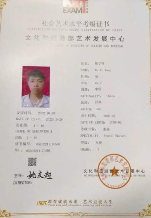 徐子轩同学荣获九级证书