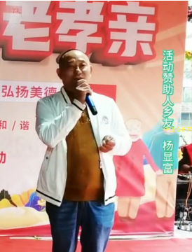 金秋十月,丹桂飘香。今年10月11日即农历九月初九,杨显富与往年一样,由成都回到南部县参加南隆街道办事处太洪社区组织的 “敬老月”启动仪式现场,由他捐资办了13桌坝坝宴,招待本村老年人共进午餐,还为高龄老人发放红包。杨显富已经连续十年资助家乡每年举行的重阳节和清明节活动,他心里十刻装着农村留守老人和儿童,家乡群众对他助人为乐的事迹传为佳话。