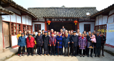 图:杨显富在重阳节活动现场与镇村领导合影留念