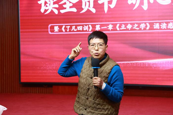 主持人焦庆亮主任在开场致辞中表示:“今天,我们以经典为媒,以感悟为桥,齐聚一堂,既是一场关于《了凡四训》的诵读分享,也是一次自我与心灵的深度对话。”随后,他带领全场共同诵读了《立命之学》的经典段落,让大家在了凡先生从深信宿命到觉醒转变的故事中,感受那份觉醒的力量。