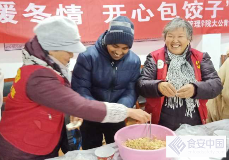 食安中国网__产经新闻讯:(施智溢 冷俊成)2018年12月8日下午2点,江苏科技大学经济管理学院暖风服务社的志愿者与国际学院的留学生们一起为俏夕阳党员工作室的老人送去温暖,开展“暖冬情,包饺子”活动。