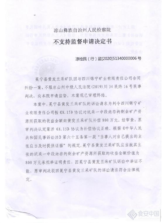 6月7日,四川省冕宁县黄发兰采矿队负责人黄发兰(经录音整理)向媒体反映:我是该矿采矿队的队长,我向您反映四川省冕宁县人民法院、四川省凉山彝族自治州中级人民法院、四川省高级人民法院、凉山彝族自治州人民检察院在我与四川锦宁矿业有限责任公司合同纠纷一案中故意违背事实和法律枉法裁判和渎职作出凉检民(行)监(2020)51340000006号《凉山彝族自治州人民检察院不支持监督申请决定书》的案件,我请求记者给予监督。