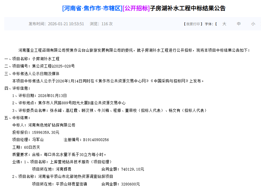 云台山子房湖补水工程作为河南省焦作市云台山风景名胜区内的重要建设项目,总投资约1600 万元,于 2026 年 1 月 14 日发布中标候选人公示。该工程由焦作云台山旅游发展有限公司作为建设单位,采用打井取水方式为子房湖补水,要求每口井出水量不低于 30 立方米 / 小时,工期 60 天。然而,经过深入调查发现,该工程在规划、审批、施工等多个环节存在严重违法违规行为,涉及建设单位、审批监管部门、参建单位等多方主体的责任。