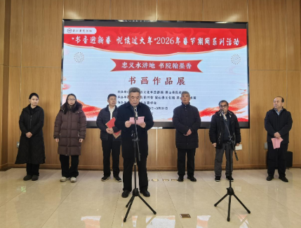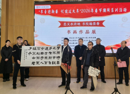 产经网:2月6日上午在济宁市梁山县图书馆开展,2026年2月6日,初春天气,乍暖还寒,适值马年新春佳节即将到来之际,济宁市梁山县图书馆迎来了筹备已久的迎新春“忠义水浒地·书院翰墨香”主题书画展的开展仪式。本次书画展由济宁市梁山县文化和旅游局、梁山县民政局主办,济宁市梁山县图书馆、济宁市梁山县文化馆、济宁市梁山青山书院承办,梁山县诗联学会协办,开展仪式由济宁市梁山县文旅局副局长孙继民主持,中国水浒学会理事、济宁市梁山青山书院院长李维东介绍了举办这次书画展的筹备情况与意义以及书院的发展历程,县政协原副主席徐长富与菏泽学院黄河研究院副院长、教授孙琳先后致辞,菏泽学院孙琳教授与青山书院互赠了书法作品,随后,县政协原副主席王昌珍宣布书画展开展。参加开展仪式的领导和嘉宾还有:济宁市梁山县民政局区划地名科副科长梁言,梁山县公共文化服务中心副主任、文化馆馆长朱桂芹,济宁市梁山县图书馆馆长杜娟,中共梁山县委党校原校长、济宁市梁山县诗联学会顾问王显柱,梁山县水浒书画院院长徐书钧,菏泽学院马克思主义学院办公室主任、副教授徐兴民,菏泽学院副教授时培根,菏泽学院副教授张峰,梁山县教体局原副局长、济宁市梁山县诗联学会副会长兼秘书长师恩华,济宁市梁山县诗联学会副会长陈克启、杨凤言、闫振谦等社会各界书画及文史爱好者。