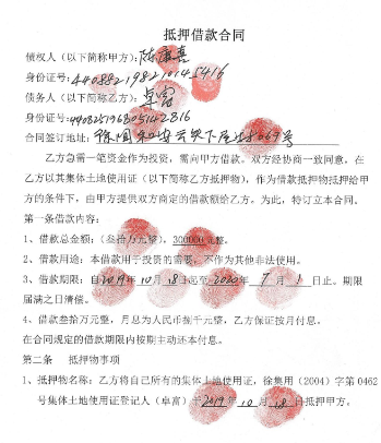 据陈康喜提供的《抵押借款合同》书,于2019年10月28日,徐闻县和安镇云头下尾村卓富将以上集体土地使用证向陈康喜抵押借款叁拾万元,作为投资款使用。