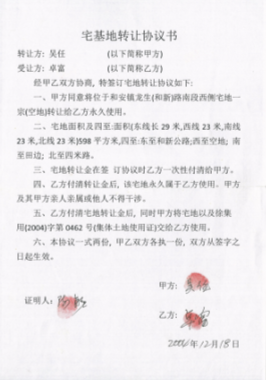 2004年12月18日,卓富向吴任购买位于徐闻县和安镇龙生(和新)路南段西侧宅基地,证号为徐集用(2004)字第0462号,双方办理了《宅基地转让协议书》。