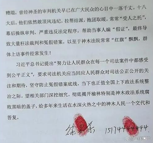 习近平总书记提出“努力让人民群众在每一个司法案件中都感受到公平正义”,要求司法机关应当回应人民群众对司法公正公开的关注和期待,坚守防止冤假错案底线,当下也正值全国上下政法系统整治之际,望相关部门深挖细究,彻底揭开榆林特别是神木政法系统腐败黑暗的盖子,给多年来生活在水深火热之中的神木人民一个交代和答复。