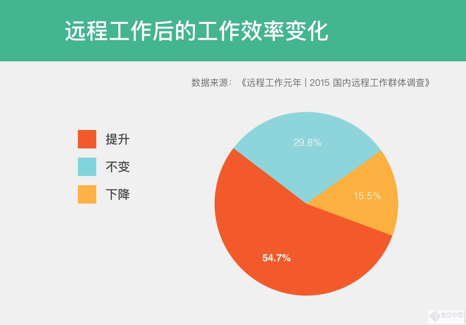 猫头鹰实验室的数据显示,选择远程办公的员工,其工作效率比在企业现场办公员工还高出20%;且远程办公者的绩效与在企业现场办公者绩效相同。而国内的市场机构一早一晚的数据显示,国内超过一半( 54.7%)的受访者表示开展远程工作后,自己的工作效率得到了提升。