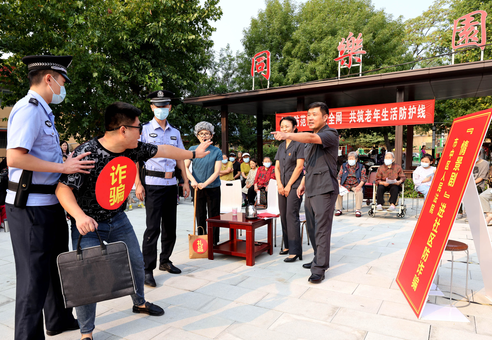 9月12日,山东省枣庄市市中区人民法院干警在龙山路街道荣华里社区表演自编的防范养老诈骗“情景剧”。