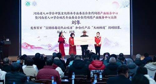 河南省人口学会姓氏专业委员会食药同源产业服务中心,联手河南秘要医疗管理有限公司, 共同首推出河南大医健康科技研究院执行院长刘天章研究员研发的“宣肺排毒退热止咳汤”,在启动大会上,河南省人口学会中医文化传承专业委员会食药同源产业服务中心暨河南省人口学会姓氏专业委员会食药同源产业服务中心主任刘隼,上台郑重宣布面向郑州进行百万“宣肺排毒退热止咳汤”和食疗产品“天地畅通”捐赠招募。