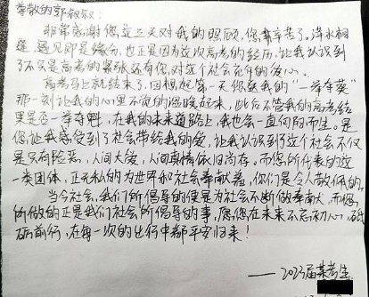 一名考生代表在感谢信中说:“感谢郭叔叔在这高考三天对我的陪伴、接送,让我感受到了社会的温暖、人间的大爱。今后,我也会参与志愿服务活动,去帮助更多需要帮助的人。”