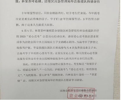 爱心送考!涪陵区应急管理局华岩救援队收到锦旗和感谢信