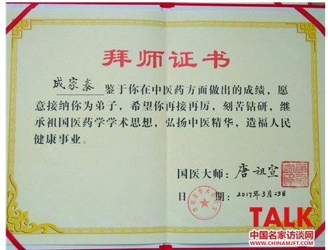 成家泰,25岁,成名的长子,中医世家第四代传承人,中医临床8年,国医大师唐祖宣传承弟子,高级特色传统疗法师,健康管理师,兼职中国民族医药学会科普分会理事,中国中医药硏究促进会唐祖宣医学工作委员会理事。曾师承于中国中医科学院博士生导师沈绍功(上海沈氏女科第19代传人,先祖为明代御医)。现在湖北易杏堂阳新中医硏究所工作。