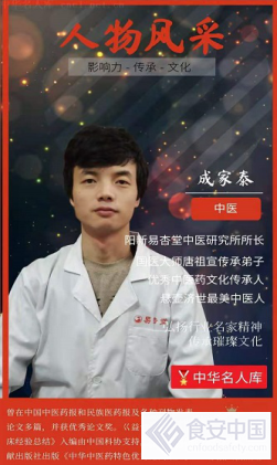 成家泰,1994年生,26岁,中医世家第四代传承人。科普专家,高级特色传统法师,健康管理师,阳新易杏堂中医研究所所长。从小从父亲成名学习中医,现临床九年。上海沈氏女科(明朝御医)第十九代传人沈绍功教授传承弟子,国医大师唐祖宣传承弟子,中国民族医药学会科普分会理事,中国中医药研究促进会唐祖宣医学工作委员会理事,国学文化传承工作委员会会委员。参加过多次大师讲经典学习班;国家中医药管理局名老中医学术思想流派传承学习班;国医名师沈绍功(明代御医第十九代传人)临床经验高级师承班;国家专业技术人才知识更新工程中医师研修班;中国中医科学院中医药科技合作中心中医特色培训班学习。获得优秀中医药文化传承人,悬壶济世最美中医人,德技双馨中医人风尚奖,2020健康科普之星,2020新时代行业先锋人物。2020年度最美名中医等荣誉。