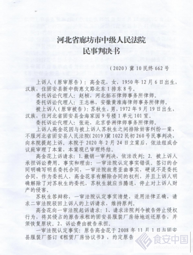 高金花无奈的向记者出示(2020)冀10民终662号《廊坊市中级人民法院民事判决书》。
