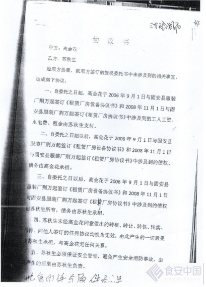 高金花痛苦流涕,向记者提供了和苏秋生的协议书(节录):自委托之日以后,高金花于2006年9月1日与固安县服装厂荆万起签订《租赁厂房设备协议书》和2008年11月1日与固安县服装厂荆万起签订《租赁厂房协议书》中涉及到的债权由苏秋生所有,债务由苏秋生承担;苏秋生未经高金花同意做出的转租、转让、转包、转卖、抵押、同他人签订的任何协议均视为无效,由此产生的一切后果由苏秋生承担,与高金花无任何关系。
