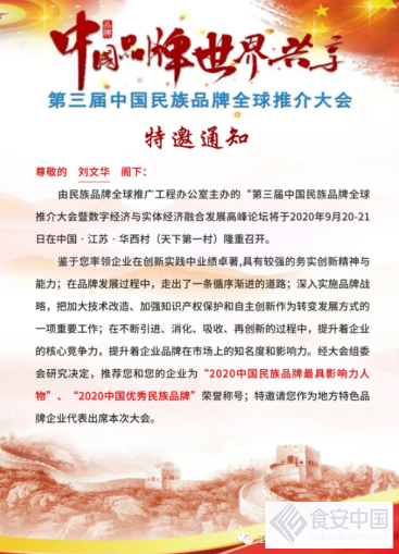 2020年9月20-21日,以"民族品牌世界共享、数字驱动智能发展"为主题的第三届中国民族品牌全球推介大会暨数字经济与实体经济融合发展高峰论坛将在中国"天下第一村"江苏华西村隆重召开,“火凤舞”品牌联合创始人暨江西久乔生物科技公司刘文华董事长作为中国大健康产业的领军人物,受邀出席本次会议。