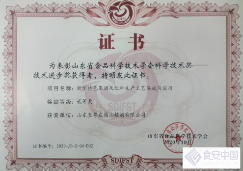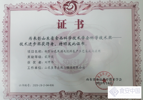 据悉,山东省食品科学技术学会设立“山东省食品科学技术学会科学技术奖”,以奖励在食品科学技术进步活动中做出突出贡献的个人和组织,促进山东省食品科技事业的发展。奖项设置技术进步奖、技术发明奖、产品创新奖等三个专项奖,均分设一、二、三等奖。山东皇尊庄园山楂酒有限公司申报的“新型特色果酒及饮料生产工艺集成与应用”项目和董事长刘甲伟分别荣获2020年度山东省食品科学技术学会科学技术奖——技术进步奖二等奖。