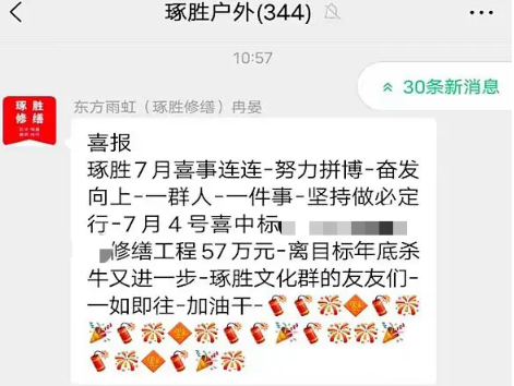 当日,总经理冉晏在琢胜户外群上通报了一个令人激动的消息:公司成功中标价值57万元的涪陵区某一单位修缮工程。一直以来,琢胜修缮的全体员工努力拼搏、奋发向上,始终坚信“一群人,一件事,坚持做必定行”。此次中标,是团队齐心协力、共同奋进的成果,也为实现年底“杀牛目标”增添了强大动力。