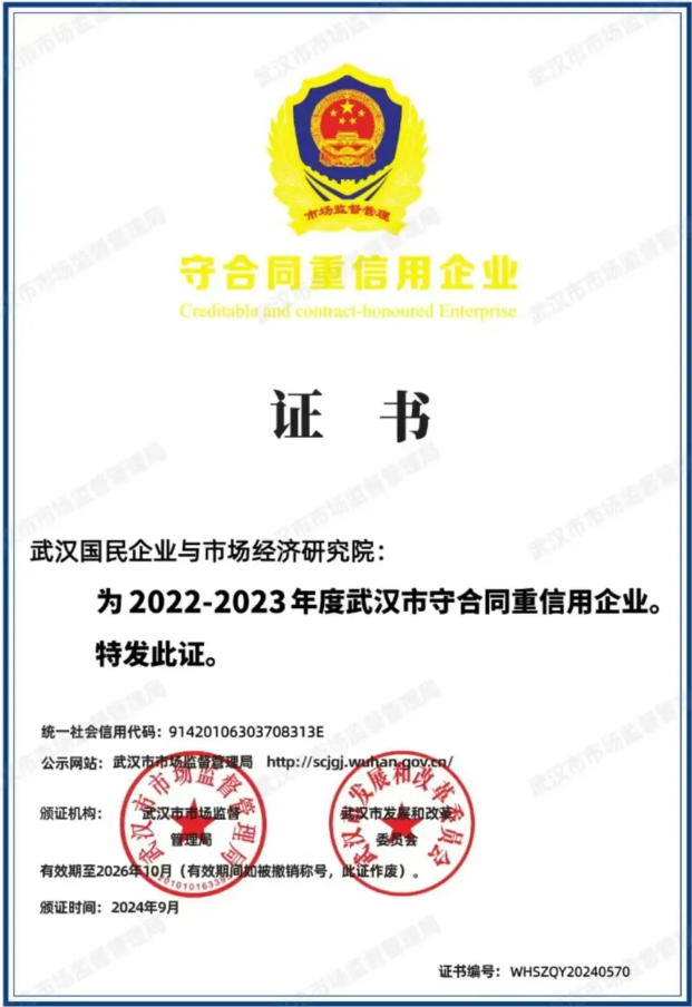 另悉,近日,武汉市市场监督管理局与武汉市发展和改革委员会联合发布了重要公告,公布了2022-2023年度武汉市“守合同重信用”企业名单。其中,武汉国民企业与市场经济研究院凭借其卓越的合同信用管理体系、高度的社会责任感以及长期以来的诚信经营,荣获“守合同重信用企业”称号。