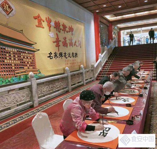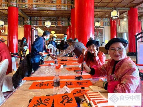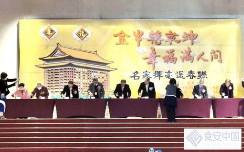 2021年1月30日台湾台北是圓山飯店书画名家挥毫写春聯,杰出艺术家杨静江老师是开笔官之一,为大家挥毫书写福字与春联。(照片中杨静江老师位于左一)
