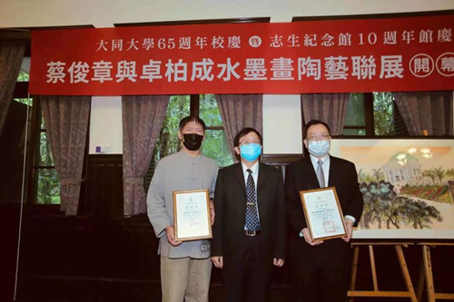 杰出水墨画家蔡俊章(右)、陶艺家卓柏成(左)荣获大同大学校长何明果(中)颁发感谢状。