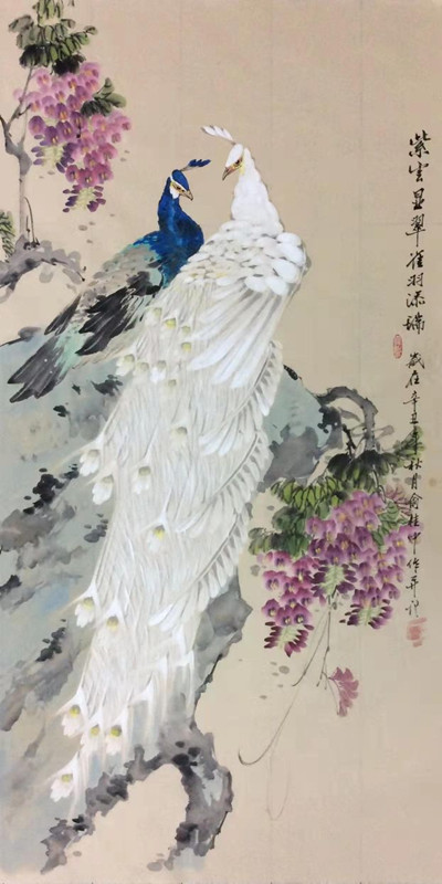 俞桂中老师作品《紫云显翠,雀羽添瑞》
