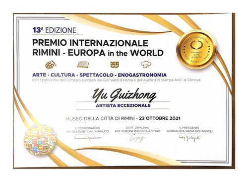 2021年10月22日,在欧洲艺术中心意大利的雷米尼市,是一年一度为世界杰出艺术家颁发勋章的日子,中国的杰出艺术家俞桂中老师也金榜题名,这是今年中国唯一在欧美艺术界获得此项艺术奖的书画家,可喜可贺!