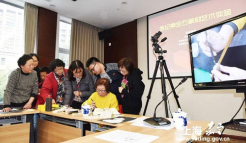 张纪秦老师桃李满天下。上图为张老师为学生们展示篆刻技艺。
