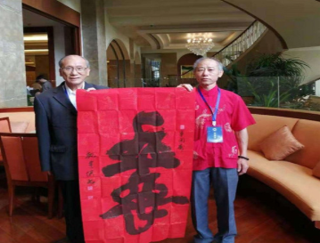 魏建培老师为著名国学大师丁椿寿老师(丁老是二十多国家的客座教授)书写寿字。