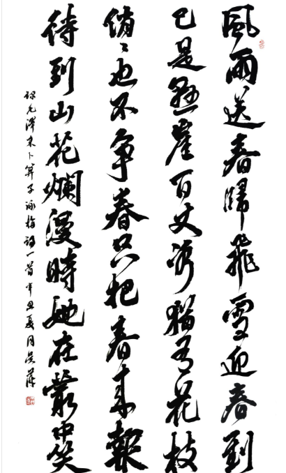 吴萍宗法二王,以《书谱》为圭臬,上溯《礼器》《张迁》,接续王铎、张瑞图,志气和平,踔厉奋发。