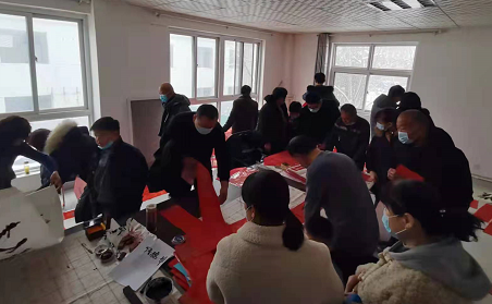 我们一行4人挥毫泼墨,笔走龙蛇,各式写法的福字,鲜红的对联或行书,草书、楷书不同的字体,不同的风格,饱含着相同的内容——美好的祝愿。