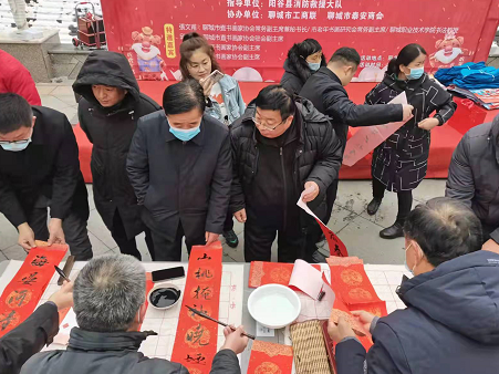 其中有一幅联可称的上网红.写的遍数最多“年逢寅虎群情奋.岁到丑牛大地春”横披:金虎纳福。有的走了又来.给邻居也写这幅,有的千脆手机联系、说开车的师傅也要这一幅。有一年轻女职工拿着手机示意要康熙皇帝的多子多才多田多寿的“福”,福字到手后,连连作揖表示谢意。脸上乐开了花。为群众办实事,群众满意就是我们的目标。