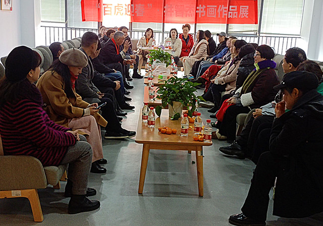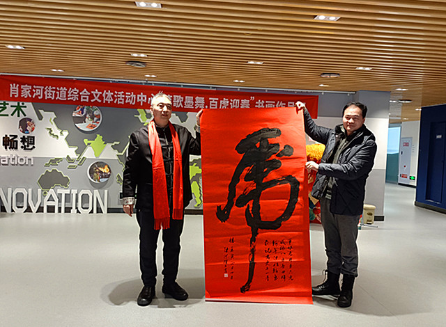 前来观展的嘉宾们络绎不绝,对书画家井智杰先生的高超艺术水平赞不绝口。成都市书法家协会副秘书长、锦江区书法家协会常务副主席兼秘书长陈洪现场向井智杰先生赠送了一幅由自己创作的一幅大写的虎字书法作品,同时在这幅作品上还配诗一首:“军旅老井画只虎,威振八方春回眸。新年伊始新气象,祝君更上一层楼。”