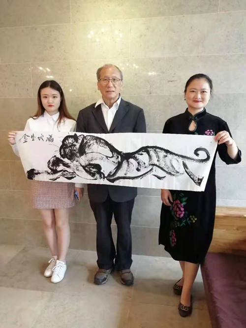2019年韩国首尔蔡丰名博士典藏翰林书画名家冯义兵老师作品并与中国翰林书画院秘书长刘珺女士与艺术新秀徐慧玮女士手持冯义兵老师墨宝蹦虎图《福地生金》合影