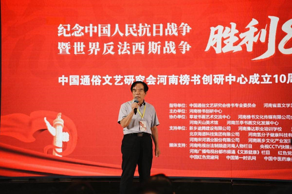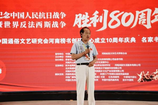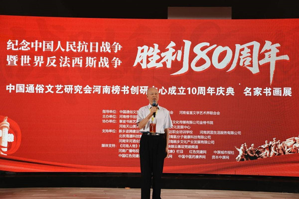 中国通俗文艺研究会榜书委员会副会长,河南榜书创研中心主任李存立先生致辞,首先向各位领导、嘉宾以及艺术家们的到来表示亲切的问候真挚的感谢,重点阐述了这次举办纪念抗日战争暨世界反法西斯战争胜利80周年的重大意义,回顾了河南榜书创研中心十年来的发展历程,始终坚持以人民为中心的创作导向,致力于传承和弘扬中华优秀传统文化,在推动榜书艺术发展和公益事业方面做出的重大贡献。